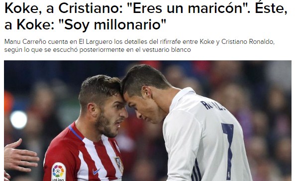 Cadena Ser isimli bir İspanyol radyosuna göre, karşılaşmanın bir pozisyonunda kafa kafaya gelen Koke, Ronaldo'ya "İ.ne" dedi. Yıldız futbolcunun sinirlenmesini bekleyen Koke, iddialara göre bu amacına ulaşamadı ve futbolcudan "İ.ne olabilirim, ama çok zengin bir i.neyim p.şt" cevabını aldı.
