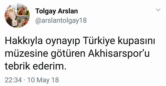 Twitter üzerinden bir mesaj paylaşan Tolgay, "Hakkıyla oynayıp Türkiye kupasını müzesine götüren Akhisarspor’u tebrik ederim." ifadelerini kullandı.