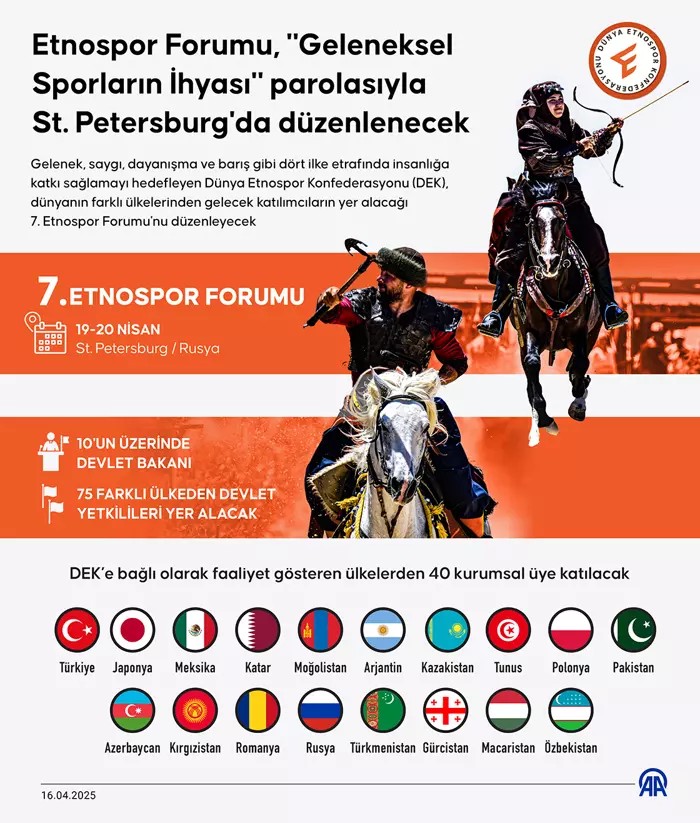 Gelenek, saygı, dayanışma ve barış gibi dört ilke etrafında insanlığa katkı sağlamayı hedefleyen Dünya Etnospor Konfederasyonu (World Ethnosport), dünyanın farklı ülkelerinden gelecek katılımcıların yer alacağı 7. Etnospor Forumu'nu Rusya'da düzenleyecek.